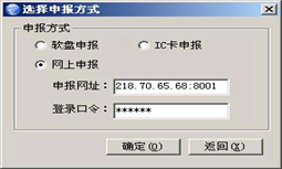 在点击【数据上报】后,在【申报模式】选择界面中选择了网上申报模式,网络连接成功后,如果第一次运行本系统,请输入重庆市国家税务局提供的申报网址:218.70.65.68:8001。以后运行时,就不用再输入申报网址了,除非申报网址变更。然后输入您的登录口令,初始口令为666666.单击[确定]按钮