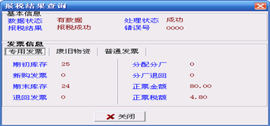 1、 点击“远程报税/报税结果查询”菜单项, 系统自动向服务器提出请求,如果查询报税结果成功,系统会显示如图所示的界面。用户通过点击“发票信息”下的“专用发票”、“废旧物资”及“普通发票”来查看各种发票领用存信息和本期报税数据的合计金额税额等。