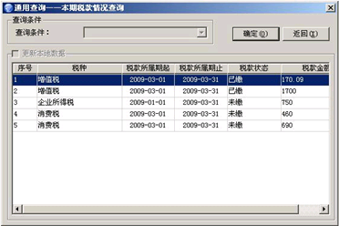 注: 每个税种暂时只允许从网上发起扣款一次,扣款成功不允许再次发起扣款,避免重复扣款;扣款失败也不允许再次扣款,只能到办税服务厅打印缴税凭据,按原办法缴税。 5、税款状态查询 点击操作平台左侧的树结构菜单 [通用查询] 菜单,双击右侧的 [ 本期税款情况查询 ] 模块。