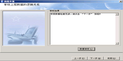 点击 [数据审核] 按钮进行审核,如果审核不通过,浏览框中会出现详细提示,需要重新修改报表后再进行申报。审核通过后,点击 [下一步] 按钮,再点击 [上传数据]按钮,系统开始上传申报数据,待核定数据审核无误后,网上申报系统会自动进行“一窗式”比对,数据比对通过的,提示用户网上申报成功,数据比对不符的,在此提示用户比对信息不符,请携带相关资料前往征收大厅异常窗口办理。