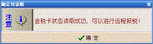 1、读取金税卡报税状态 操作步骤: 点击“报税状态/读取金税卡报税状态”菜单项,系统便提示“正在读取金税卡和IC卡状态”,稍后给出读取成功的提示信息,如图所示。查看完毕,点击对话框中的“确定”按钮即可。