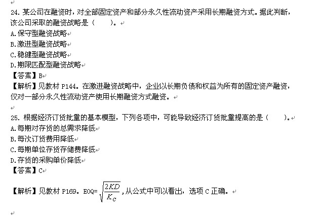 14.某公司预算年度计划新增留存收益为150万元,目标股利分配额为600万元,适用的所得税率为25%,则目标利润总额是( ). A.337.5万元 B.562.5万元 C.750万元 D.1000万元 【答案】D 【解析】目标利润总额=(150+600)/(1-25%)=1000(万元)(见教材27页) 15.下列各项中,不会对预计资产负债表中存货金额产生影响的是( ). A.生产预算 B.材料采购预算 C.销售费用预算 D.单位产品成本预算 【答案】C 【解析】销售及管理费用预算只是影响利润表中数额,对存货项目没有影响。(见教材35页) 16.在通常情况下,适宜采用较高负债比例的企业发展阶段是( ). A.初创阶段 B.破产清算阶段 C.收缩阶段 D.发展成熟阶段 【答案】D 【解析】见教材P86。一般来说,在企业初创阶段,产品市场占有率低,产销业务量小,经营杠杆系数大,此时企业筹资主要依靠权益资本,在较低程度上使用财务杠杆,在企业扩张成熟期,产品市场占有率高,产销业务量大,经营杠杆系数小,此时,企业资本结构中可扩大债务资本,在较高程度上使用财务杠杆。同样企业在破产清算阶段和收缩阶段都不宜采用较高负债比例。所以只有选项D正确。 17.某公司为一家新建设的有限责任公司,其注册资本为1000万元,则该公司股东首次出资的最低金额是( ). A.100万元 B.200万元 C.300万元 D.400万元 【答案】B 【解析】见教材P44。股份有限公司和有限责任公司的股东首次出资额不得低于注册资本的20%。所以该公司股东首次出资的最低金额是200(=1000×20%)万元。 18.企业下列吸收直接投资的筹资方式中,潜在风险最大的是( )。 A.吸收货币资产 B.吸收实物资产 C.吸收专有技术 D.吸收土地使用权 【答案】C 【解析】见教材P47。吸收工业产权等无形资产出资的风险较大。因为以工业产权投资,实际上是把技术转化为资本,使技术的价值固定化。而技术具有强烈的时效性,会因其不断老化落后而导致实际价值不断减少甚至完全丧失。所以本题就选选项C。 19.某公司2011年预计营业收入为50 000万元,预计销售净利率为10%,股利支付率为60%。据此可以测算出该公司2011年内部资金来源的金额为( )。 A.2 000万元 B.3 000万元 C.5 000万元 D.8 000万元 【答案】A 【解析】见教材P71。预测期内部资金来源=预测期销售收入×预测期销售净利率×(1-股利支付率),则本题2011年内部资金来源的金额=50000×10%×(1-60%)=2000(万元) 20.下列各项中,通常不会导致企业资本成本增加的是()。 A.通货膨胀加剧 B.投资风险上升 C.经济持续过热 D.证券市场流动性增强 【答案】D 【解析】见教材P76。如果国民经济不景气或者经济过热,通货膨胀持续居高不下,投资者投资风险大,预期报酬率高,筹资的资本成本就高。选项A、B、C均会导致企业资本成本增加,所以本题选选项D。 ![]() ![]() 二、多项选择题(本类题共10小题,每小题2分,共20分。每小题备选答案中,有两个或两个以上符合题意的正确答案。请将选定的答案,按答题卡要求,用2B铅笔填涂答题卡中题号26至35信息点。多选,少选、错选、不选均不得分) 26.下列各项中,属于企业税务管理应当遵循的原则有( )。 A.合法性原则 B.事先筹划原则 C.成本效益原则 D.服从财务管理目标原则 【答案】ABCD 【解析】企业税务管理必须遵循以下原则:合法性原则、服从企业财务管理总体目标原则、成本效益原则、事先筹划原则。(见教材225页) 27.下列各项中,属于企业计算稀释每股收益时应当考虑的潜在普通股有( )。 A.认股权证 B.股份期权 C.公司债券 D.可转换公司债券 【答案】 |